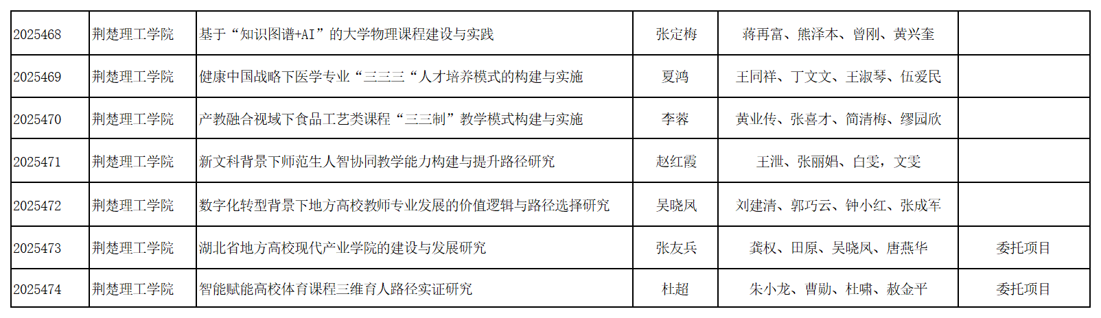 近日,湖北省教育廳發(fā)布了《省教育廳關(guān)于公布2025年湖北本科高校省級(jí)教學(xué)改革研究項(xiàng)目的通知》(鄂教高函〔2025〕17號(hào)),我校獲批7項(xiàng)省級(jí)教學(xué)改革研究項(xiàng)目,其中2項(xiàng)委托項(xiàng)目。