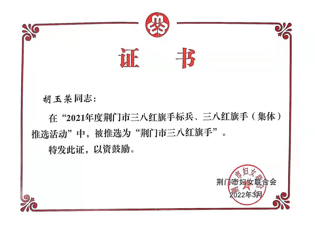 近日,荊門市婦女聯(lián)合會(huì)2021年度荊門市三八紅旗手標(biāo)兵、三八紅旗手(集體)推選活動(dòng)揭曉,我校計(jì)算機(jī)工程學(xué)院院長胡玉榮獲得“荊門市三八紅旗手”榮譽(yù)稱號(hào)。