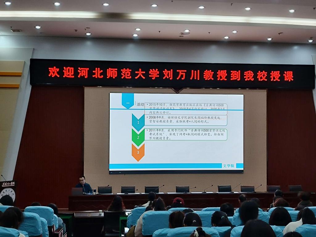 近日,文學(xué)與傳媒學(xué)院邀請河北師范大學(xué)文學(xué)院教授劉萬川博士作“古典詩詞的魅力與壓力”的學(xué)術(shù)講座。文學(xué)與傳媒學(xué)院師生200余人參加了講座。