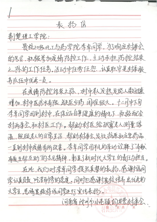 2022年12月,國內(nèi)疫情形勢較為嚴(yán)峻,發(fā)燒感染者數(shù)量持續(xù)高位增加,村中醫(yī)療水平有限,缺醫(yī)少藥,困難重重。在這一艱難時刻,李卓同學(xué)主動請纓,積極參與村委疫情防控工作,協(xié)助發(fā)放抗原和應(yīng)急藥品,幫助村醫(yī)給空巢老人測量體溫,并照顧他們的日常生活,為全村抗擊疫情作出了貢獻(xiàn)。表揚(yáng)信中盛贊李卓同學(xué)用平凡的舉動詮釋了“奉獻(xiàn)、友愛、互助、進(jìn)步”的志愿精神,彰顯了新時代大學(xué)生的責(zé)任與擔(dān)當(dāng)。