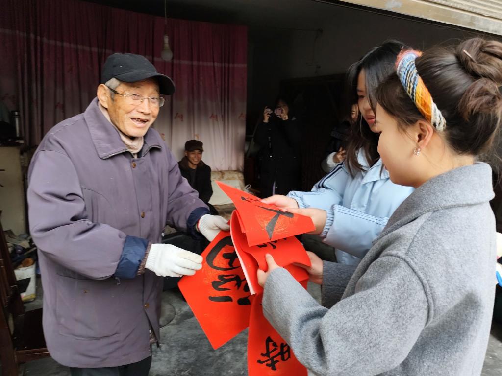 隨后,志愿者們將“福”字和對聯(lián)贈予社區(qū)老人,用“親切”和“真誠”為他們提前送去新春的慰問和祝福。在一來一回的祝福和熱情的交談中,每個人的臉上綻放出幸福的笑容,手中的春聯(lián)映照出對新年的無限期盼。