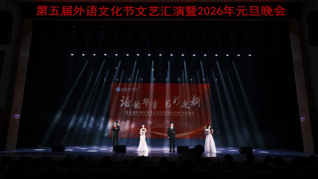 語通中外傳雅韻,藝?yán)L新元啟華章。12月28日晚,外國語學(xué)院第五屆外語文化節(jié)文藝匯演暨2026年元旦晚會在荊楚理工會堂順利舉行。學(xué)工處、外國語學(xué)院相關(guān)負(fù)責(zé)人以及學(xué)院800余名師生歡聚一堂,共賞中外文化互鑒交融的青春風(fēng)采,共同迎接新年的到來。