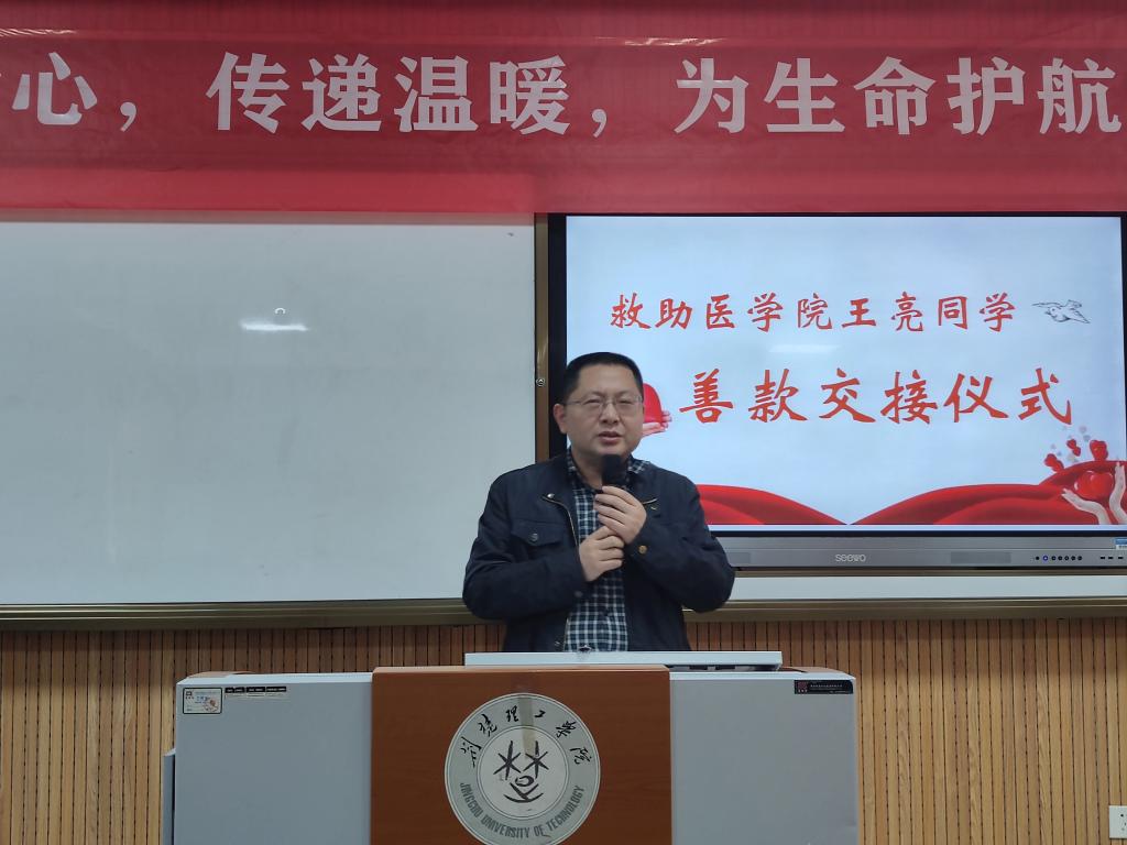 醫(yī)學院全體師生積極響應(yīng),紛紛慷慨解囊,短時間內(nèi)捐款三萬余元。醫(yī)學院院長葉建中代表學院將善款交至王亮手中,并祝愿王亮戰(zhàn)勝病魔,早日重返校園。